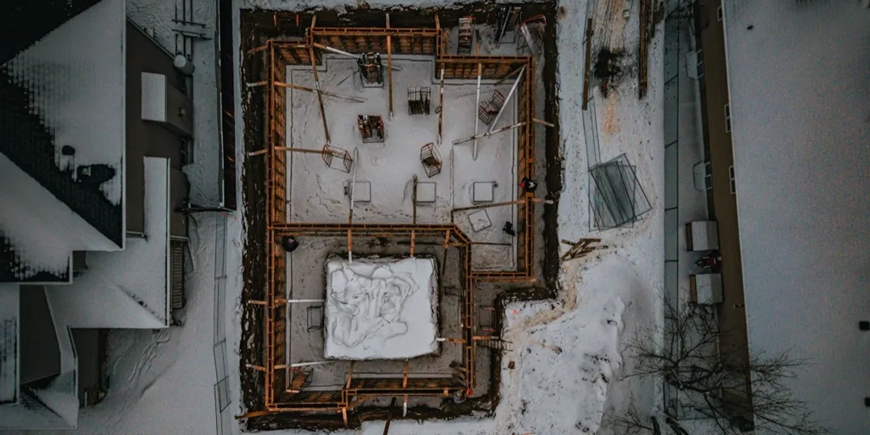 Aerial imagery capturing excavation depth, footing layout, and site access to support accurate foundation planning and verification.